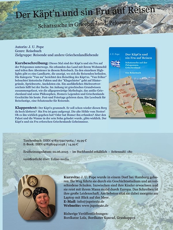Freut euch auf neue Geschichten vom Käpt’n und seiner Fru. Diesmal sind wir mit ihrem Wohnmobil auf der Insel Elba unterwegs. Elba liegt an der Italienischen Westküste und gehört zur Toskana. Diese kleine Insel birgt unglaubliche Schätze! Von hier wurden die Granitsäulen nach Rom verschifft. Das Eisenerz für etliche Wirtschaftsbooms im Laufe der letzten dreitausend Jahren wurde hier abgebaut. Napoleon lebte und wirkte auf Elba. Die Insel ist außerdem ein Tauchparadies. Fische, Wracks, sogar Flugzeuge liegen vor Elbas Küsten unter der Wasseroberfläche. Die sechs Nachbarinseln bergen ebenfalls Geheimnisse: Der Schatz von Montecristo, die im Hafenbecken versunkene Villa von Giglio, die Strafkolonie auf Gorgona. Bei meiner Recherche bin ich auf unglaubliche Abenteuer gestoßen.